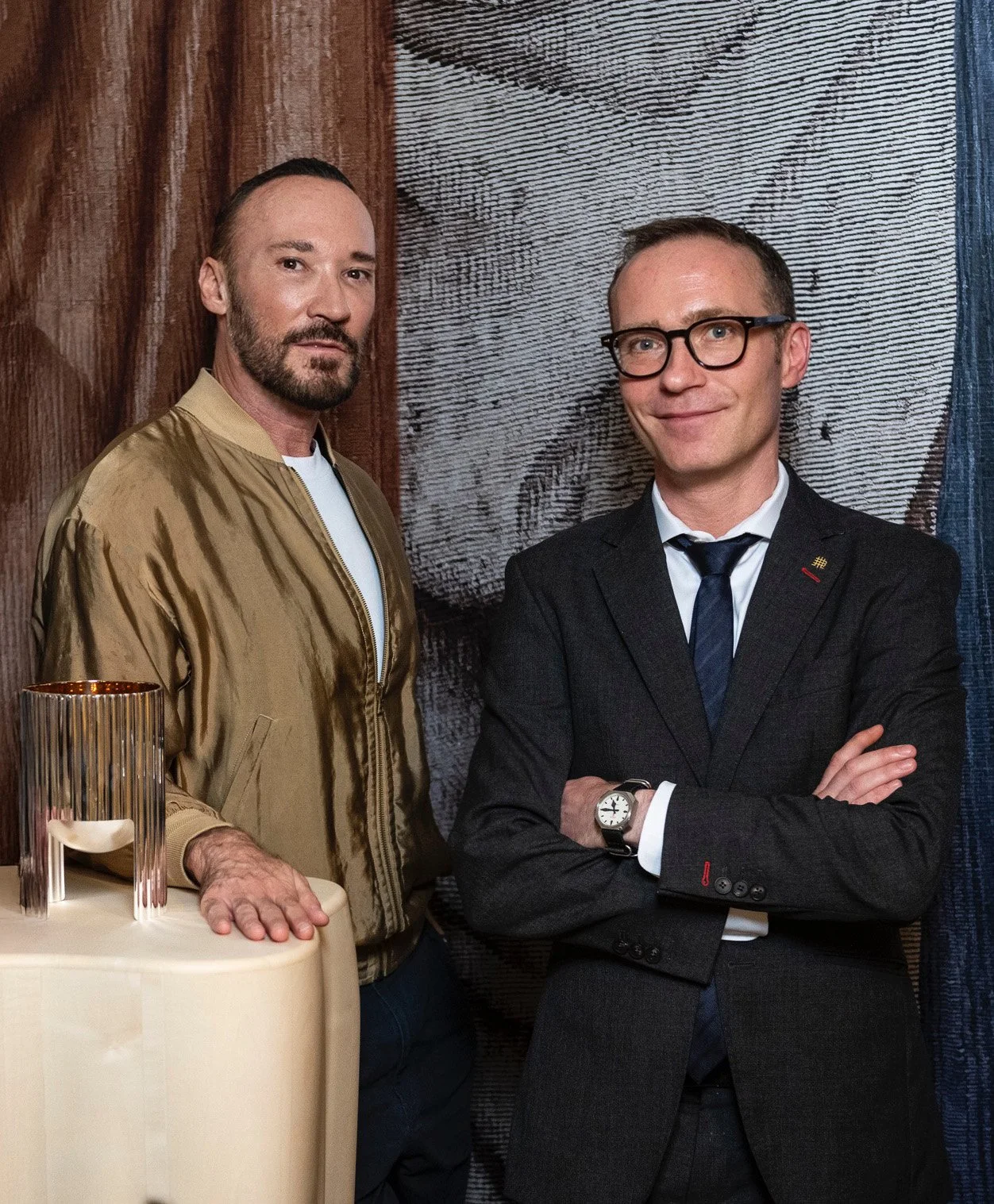 Mounted on the wall is Drapery, a monumental mural that forms part of the Artisan Collection designed by Sperlein for the Spanish house Coordonné. Inspired by classical tapestries, it blends historical references with graphic abstraction, creating an architectural surface of strong visual depth.