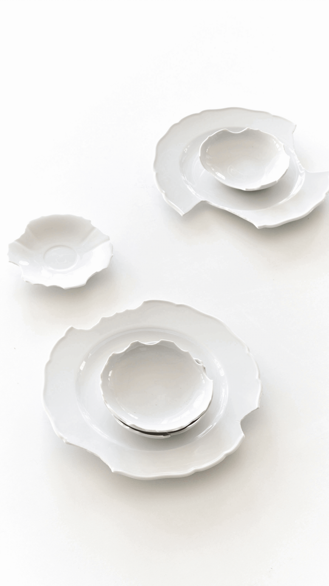 Rethinking traditional Meissen porcelain, the Phoenix tableware collection is characterised by deliberately broken, dissolved edges. Forms seem to open up, tear apart, and emerge anew. The name refers to the mythological bird that is reborn from the ashes, a symbol of renewal and transformation.